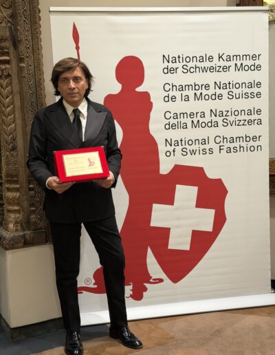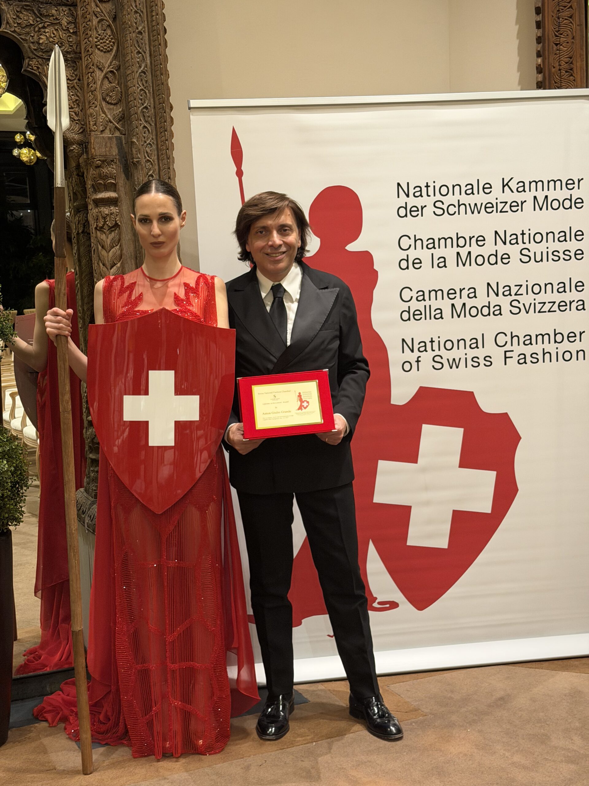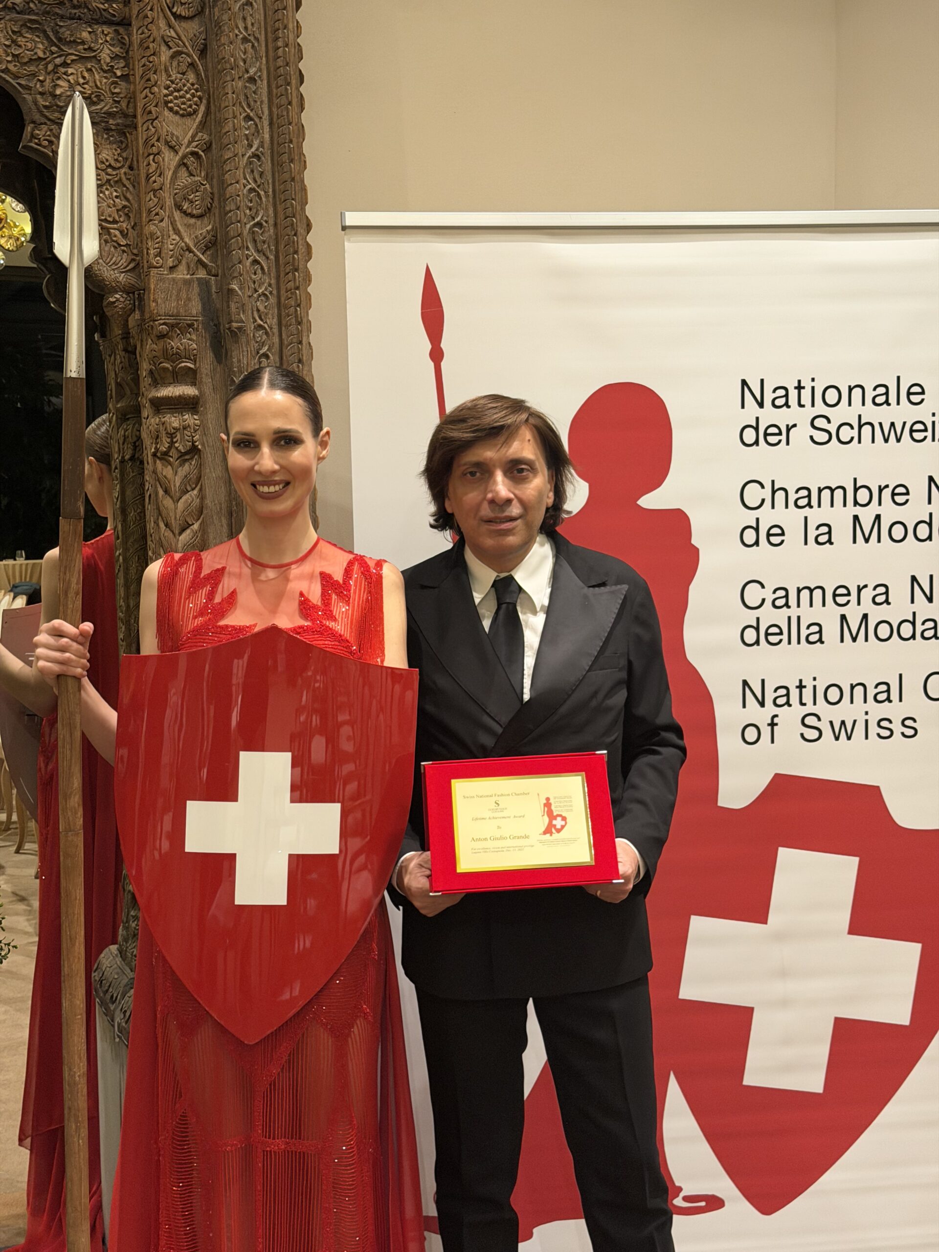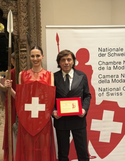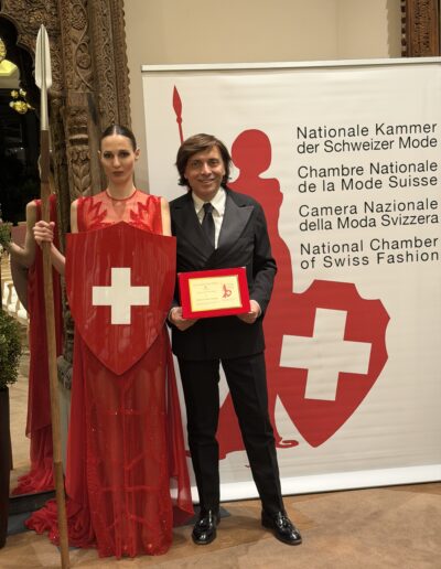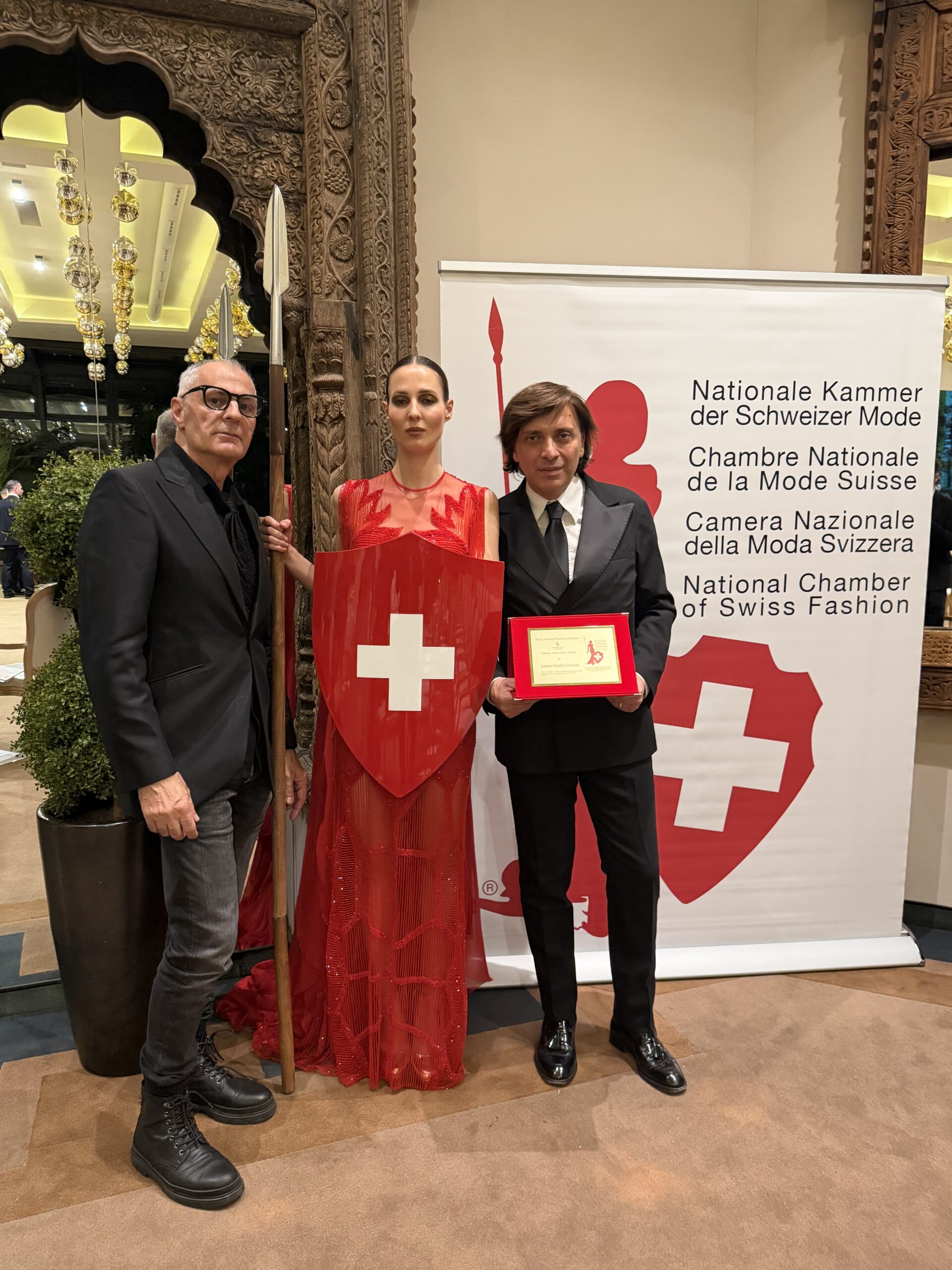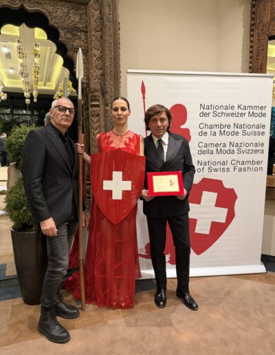 Per l’occasione, Anton Giulio Grande ha firmato una reinterpretazione contemporanea dell’Abito Istituzionale di Madre Helvetia, figura simbolica della Camera Nazionale della Moda Svizzera e della Madre Patria, mantenendone intatta la forza identitaria e valoriale, arricchita da una visione moderna, solenne e di grande impatto scenico. Idea e paternità dell’immagine istituzionale di Madre Helvetia: Franco Taranto.